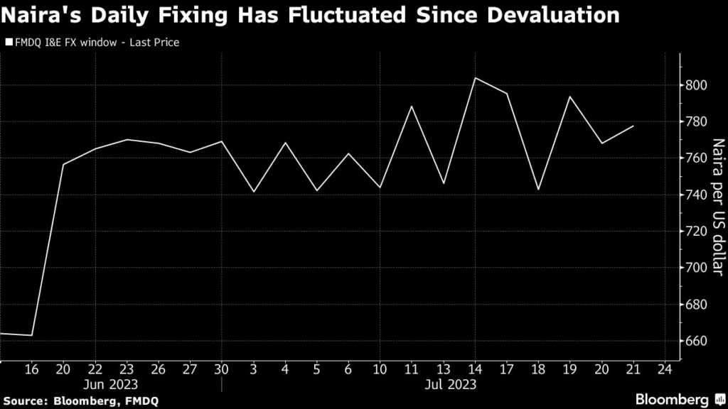 The naira has traded between 742 and 804 per dollar since June 15, the day after the Central Bank of Nigeria said it would allow the currency to trade freely in the so-called investors and exporters window, with the daily fixing on the FMDQ Exchange recognized as the official exchange rate.