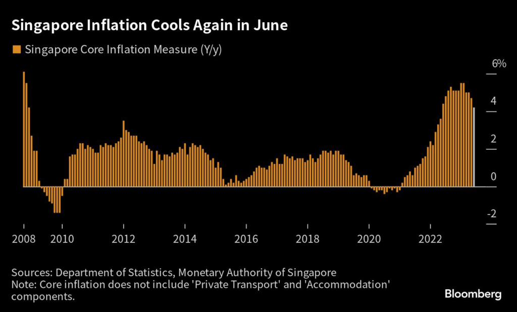 (Bloomberg) — Singapore’s core inflation rate cooled in June to the lowest level in little over a year as import costs continued to decline.