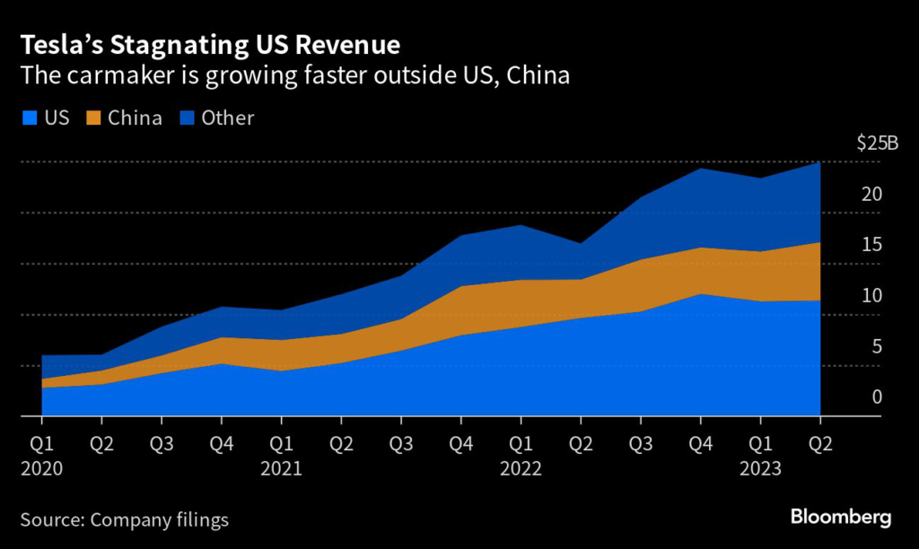 While the US remains Tesla’s biggest source of sales, revenue there has plateaued.