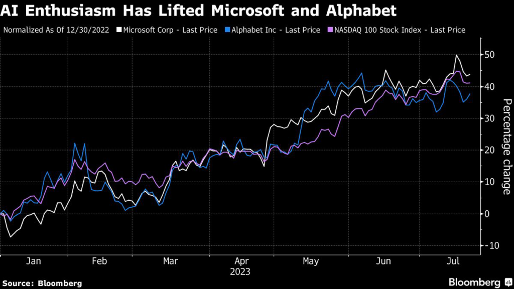 as the only two companies with market valuations of $3 trillion. Alphabet’s rally stands at 39%, slightly under the Nasdaq 100 Index’s 41% gain. Both are among the early leaders in publicly traded tech behemoths with promising AI tools.