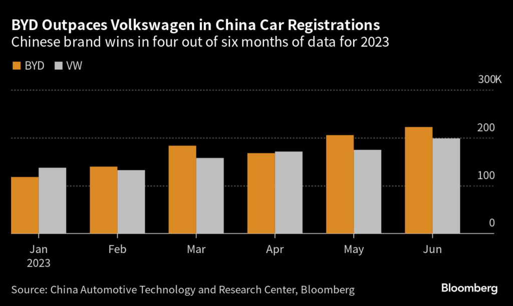 After dethroning the German giant for the first time earlier this year, BYD notched up 595,300 sales of plug-in hybrids and fully-electric vehicles in the quarter through June, increasing its market share to 11.2%, according to data from the China Automotive Technology and Research Center.