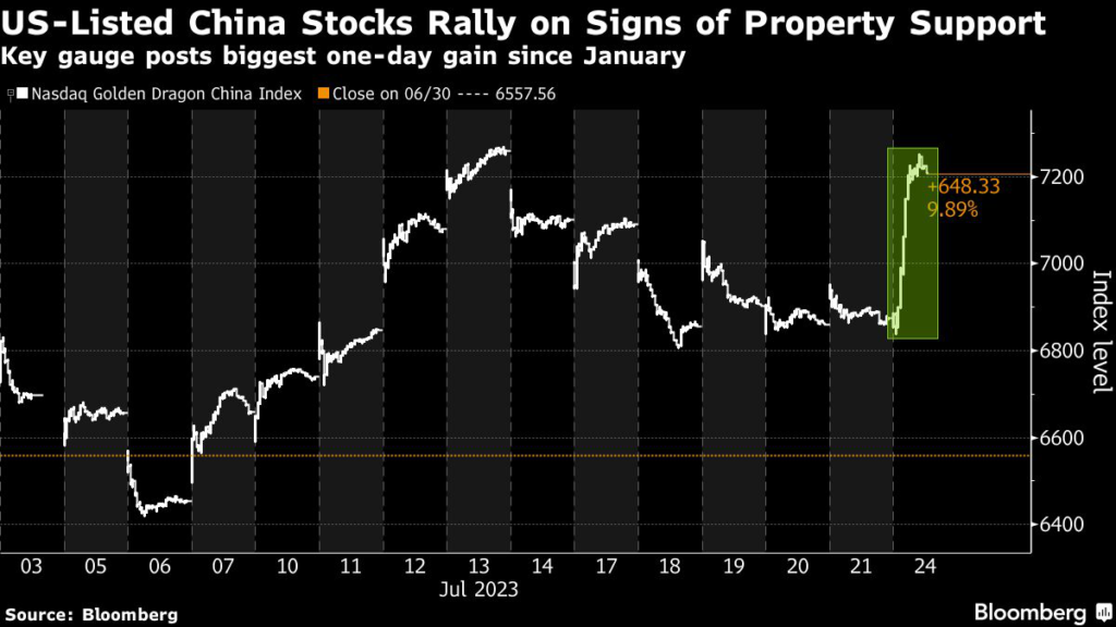 The Nasdaq Golden Dragon gauge’s move showcases a more positive response to the Politburo meeting from US investors, who have been selling Chinese stocks this year.