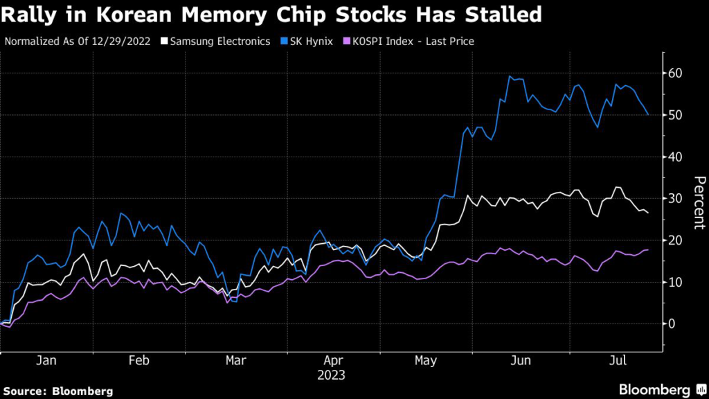 Shares of Samsung and SK Hynix have slipped this month, trimming their 2023 rallies to 27% and 50%, respectively.