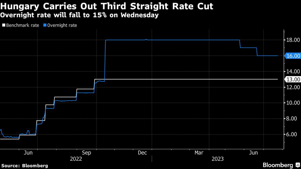 (Bloomberg) — Hungary pressed ahead with its plan to unwind its emergency monetary regime, cutting the European Union’s highest key borrowing costs to ease pressure on the economy after three quarters of recession.