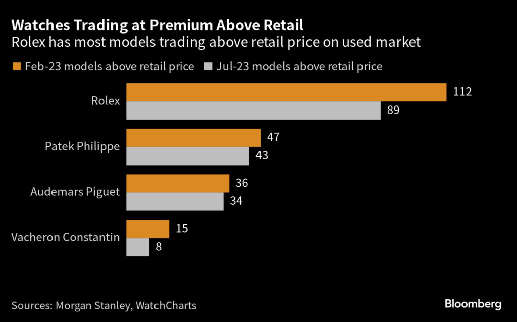 Rolex has 89 watches, representing 72% of its secondhand watch models tracked by WatchCharts, trading above retail.