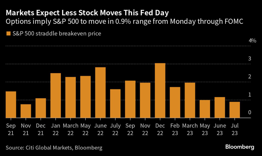 Options traders expect the S&P 500’s trading range from Monday through the end of the Federal Open Market Committee meeting Wednesday to be the tightest since November 2021, according to Citi’s Stuart Kaiser.
