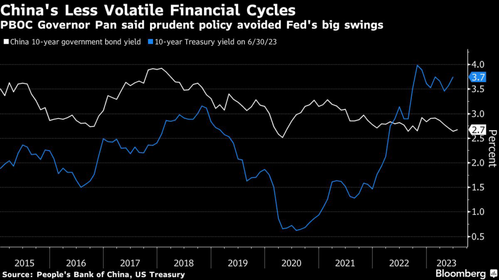 Speaking at the Lujiazui Forum in Shanghai, Pan said China’s financial cycles have been significantly less volatile than in the US, measured by the swings of sovereign bond yields.