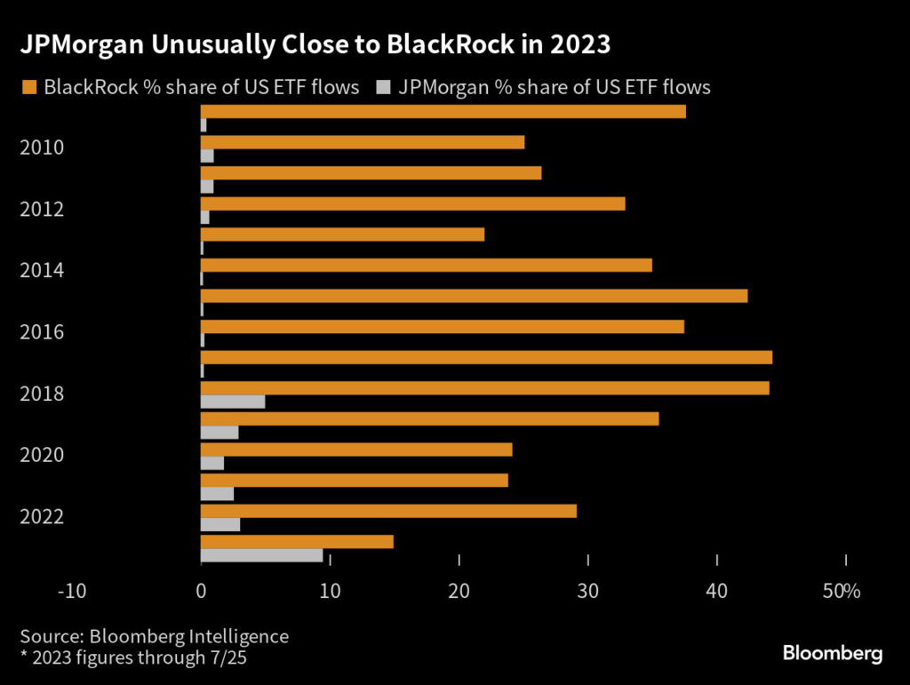 JPMorgan has raked in nearly $24 billion across its 56 US funds so far this year, which accounts for 9% of overall ETF flows in 2023, according to data compiled by Bloomberg Intelligence.