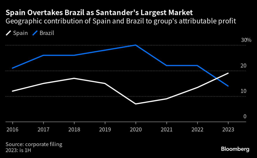 For the first time since 2009, Spain became the largest contributor to Santander’s earnings, with its domestic unit making up 22% of the group’s profit. Brazil accounted for 12%.