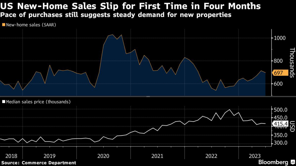 (Bloomberg) — US new-home sales declined in June for the first time in four months, suggesting high borrowing costs and prices are restraining momentum in the market.