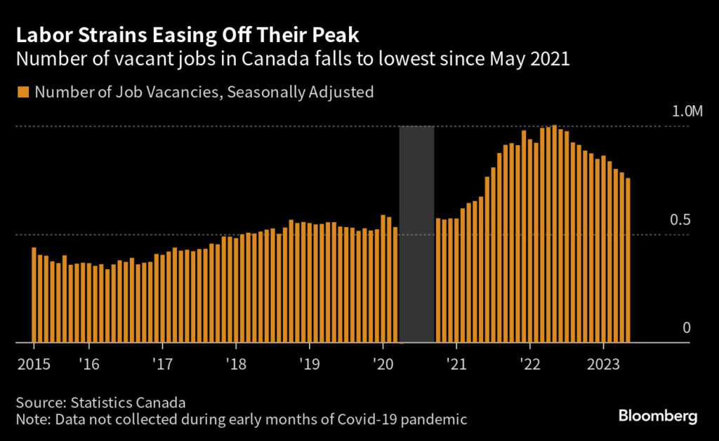 Policymakers at the Bank of Canada are watching for signs that Canada’s tight labor market is re-balancing, and have cited a decrease in vacant positions as evidence of cooling.