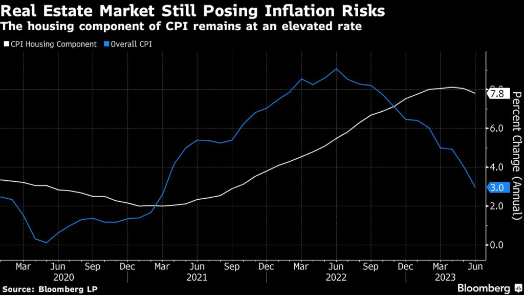 One reason: The housing market has remained resilient despite the steep jump in mortgage rates, in part because so many homeowners locked in low rates. And those elevated property prices may keep rippling through to rents, putting upward pressure on inflation gauges.