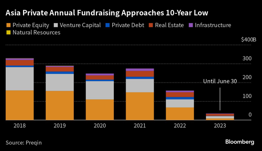 Similarly, venture capital fundraising in Asia Pacific has declined more than in other regions, contracting to $4.5 billion in the second quarter, the lowest in at least five years.