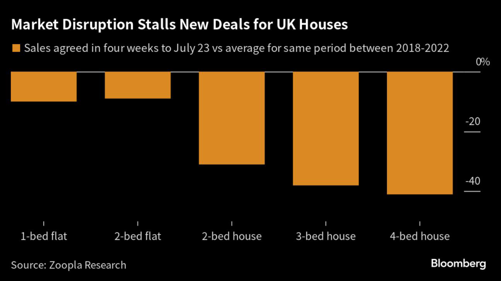 That prompted almost 7% of sellers to reduce their asking price in July — more than half above the five-year average — firming Zoopla’s forecast of a 5% decline in house prices this year as mortgage rates hover close to 15-year highs.
