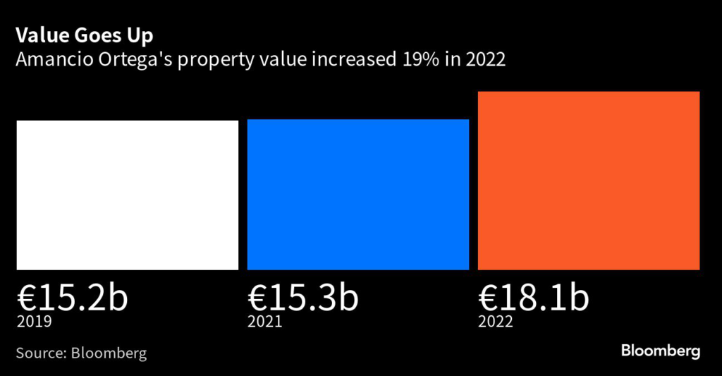 The property portfolio owned by the Inditex SA founder was valued at €18.1 billion ($20.1 billion) in 2022, up from €15.3 billion in 2021, according to a statement Thursday from Pontegadea, the firm that manages Ortega’s fortune.