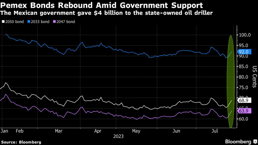 (Bloomberg) — Bonds from Mexican state-owned Petroleos Mexicanos jumped Friday, posting one of the best performances in emerging markets, after the government provided a $4 billion capital injection.