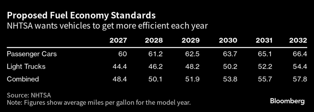 Under a proposal revealed Friday by the US National Highway Traffic Safety Administration, automobiles would reach an average of about 58 miles (93.3 kilometers) per gallon by 2032.