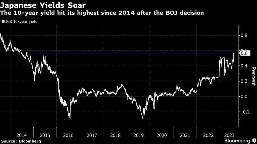 Prices tumbled on Friday, sending 10-year benchmark yields to a nine-year high, after the central bank announced that it would loosen its grip on bond yields and allow rates to rise beyond a certain level.