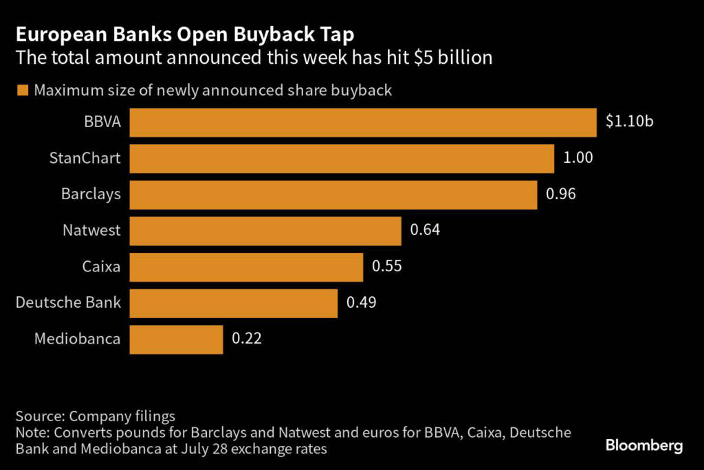 (Bloomberg) — Europe’s biggest banks announced new share buybacks worth $5 billion this week as they continue to benefit from higher interest rates.