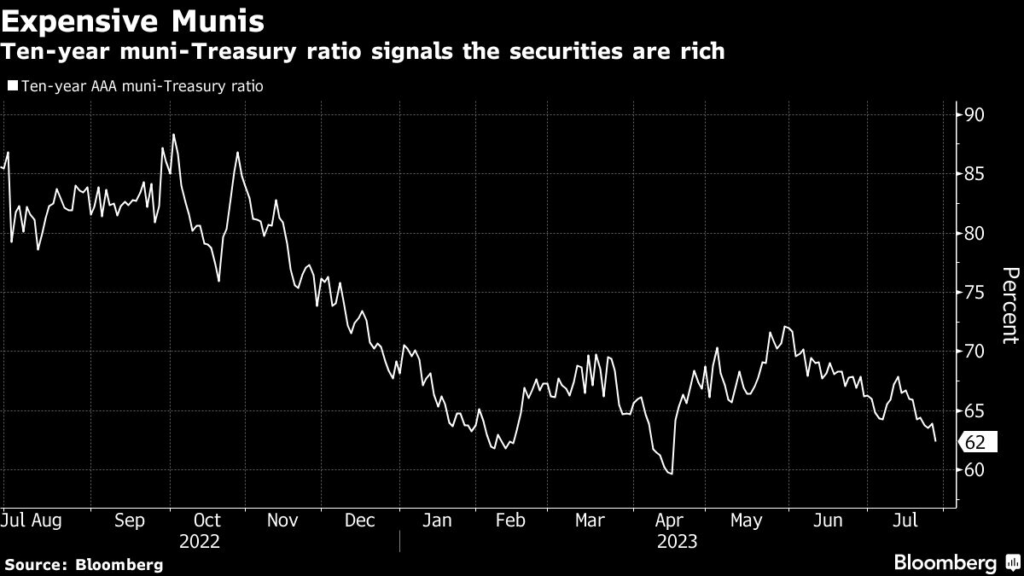 The 10-year municipal benchmark offers just 62% of the yield on similarly-dated Treasuries, well below the historical norm, according to data compiled by Bloomberg.
