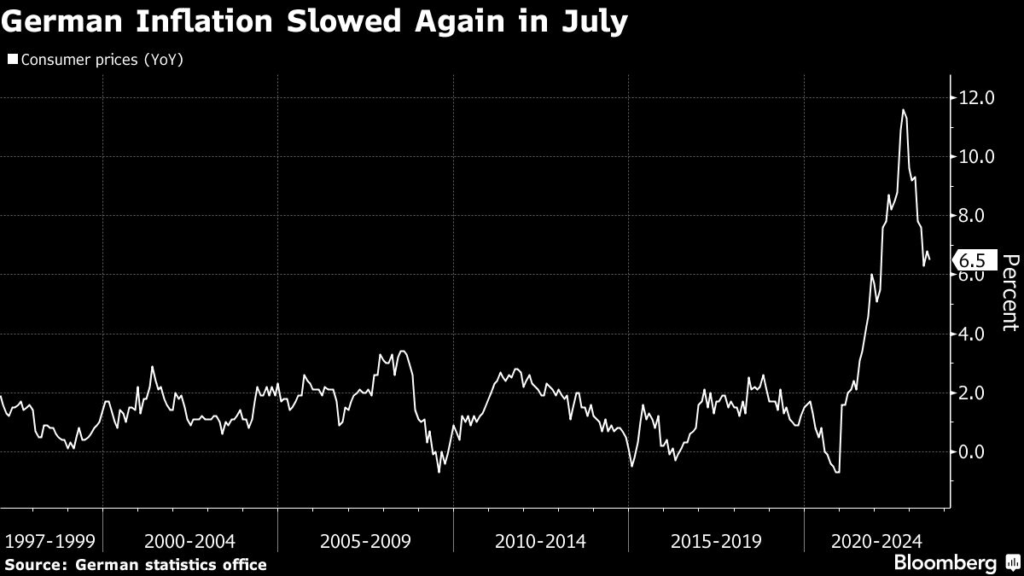 (Bloomberg) — German inflation slowed more than anticipated in July, providing more evidence of a gradual moderation in euro-zone price pressures as the European Central Bank nears the end of its unprecedented cycle of interest-rate hiking.