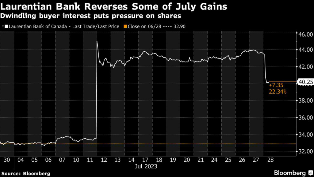 (Bloomberg) — Laurentian Bank of Canada shares tumbled as much as 9% on a report that Bank of Nova Scotia and Toronto-Dominion Bank dropped out of the running to acquire the Montreal-based lender.