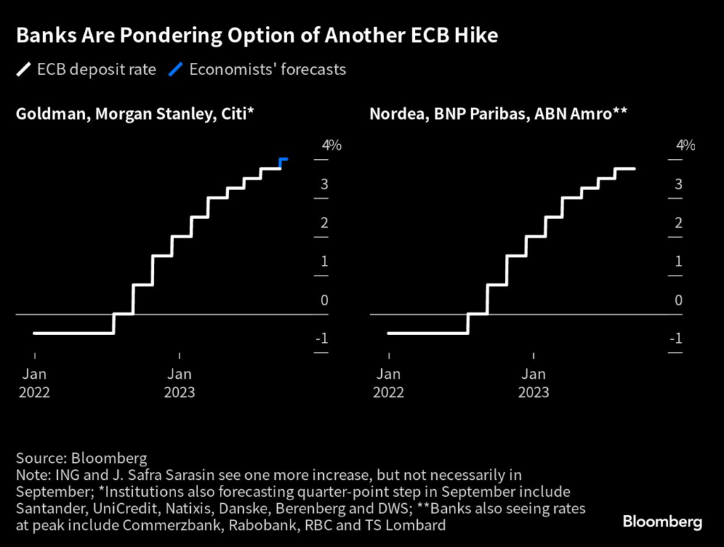 “Given our expectations on inflation and growth, we maintain our view that the ECB will deliver another 25 basis-point hike in September, and stop there with a terminal rate of 4%.