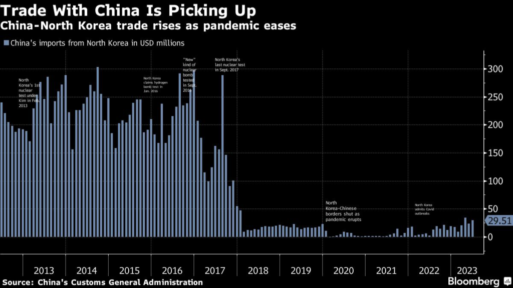 - North Korea’s exports more than doubled in 2022 to $1.6 billion, the Bank of Korea said.