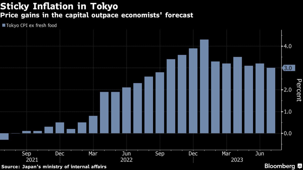 (Bloomberg) — Inflation in Tokyo ran slightly hotter than economists were expecting in July, an outcome that casts some doubt on the Bank of Japan’s view that price growth will slow below its target in the coming months just as Governor Kazuo Ueda and his board meets to decide on policy.