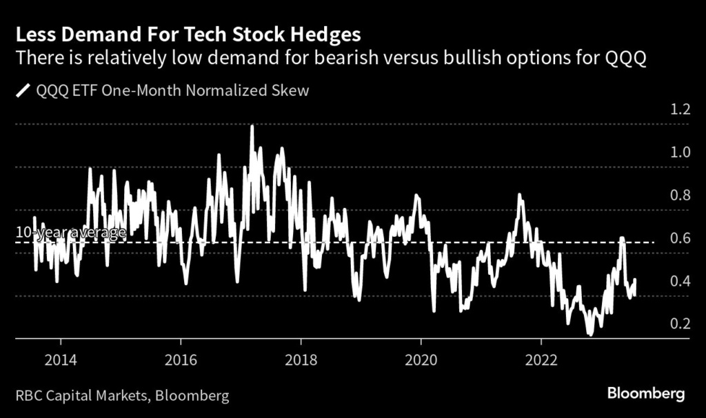 Put premiums for both Invesco QQQ Trust Series 1 (QQQ) and the SPDR S&P 500 ETF Trust (SPY) are hovering around the lowest levels in at least a decade, according to RBC Capital Markets. Additionally, investors are buying more calls to chase the rally while spending less to protect their gains.