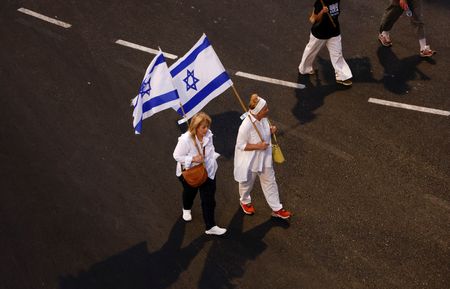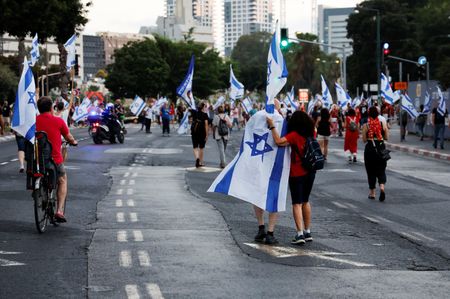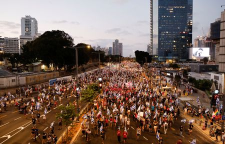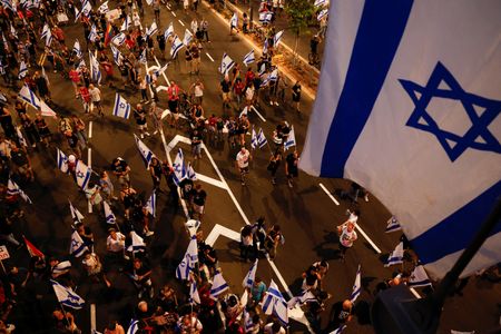 TEL AVIV (Reuters) -Tens of thousands of flag-waving Israelis renewed their protests nationwide after sundown on Saturday, capping a week of turmoil in which Prime Minister Benjamin Netanyahu pushed through a highly contested law that limited some Supreme Court power.