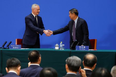 BEIJING (Reuters) -France wants better access to the Chinese market and a more “balanced” trade relationship, not a “decoupling” from the world’s second-biggest economy, Finance Minister Bruno Le Maire said on Sunday after meeting top Chinese officials.