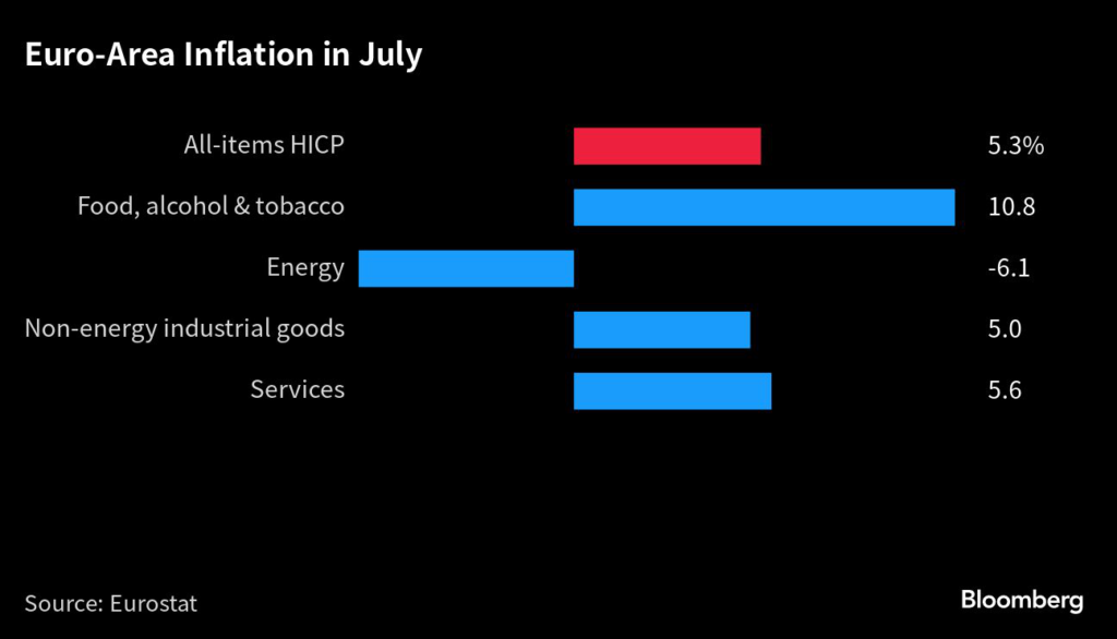A separate release showed consumer prices rose 5.3% from a year ago in July, as expected. But in a sign of lingering dangers, the closely watched underlying inflation measure that excludes volatile costs like food and energy overshot estimates by a touch to stay at 5.5%, surpassing the headline gauge for the first time since 2021.
