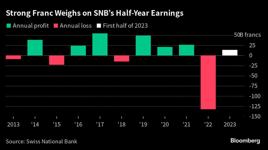 The SNB reported a half-year profit of 13.7 billion francs ($15.7 billion), according to a statement Monday, down from a gain of 26.9 billion in the three months through March.