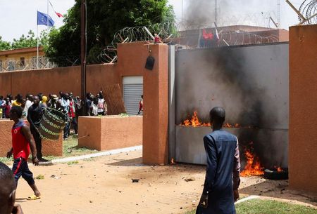 NIAMEY/ABUJA (Reuters) -West African nations imposed sanctions and threatened force on Sunday if Niger’s coup leaders fail to reinstate ousted President Mohammed Bazoum within a week, while supporters of the junta attacked the French embassy in Niamey.