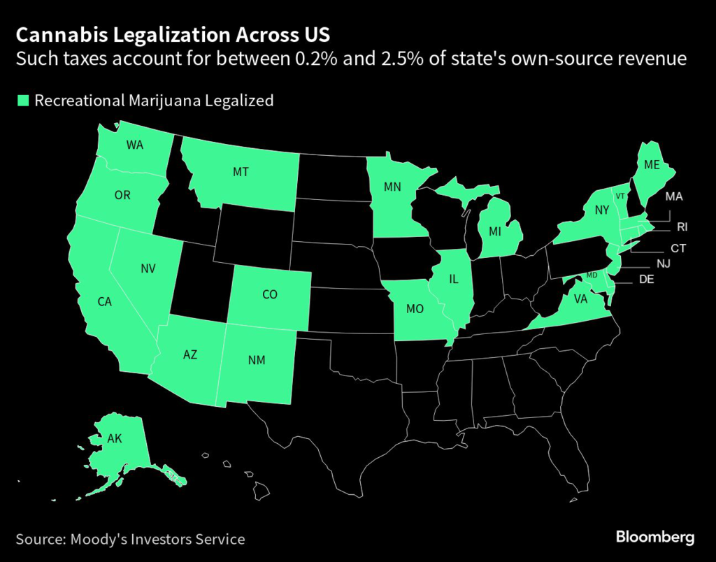 (Bloomberg) — It’ll take major shifts in tax policy for legalized marijuana to offer a meaningful boost to state and local revenues, according to Moody’s Investors Service.