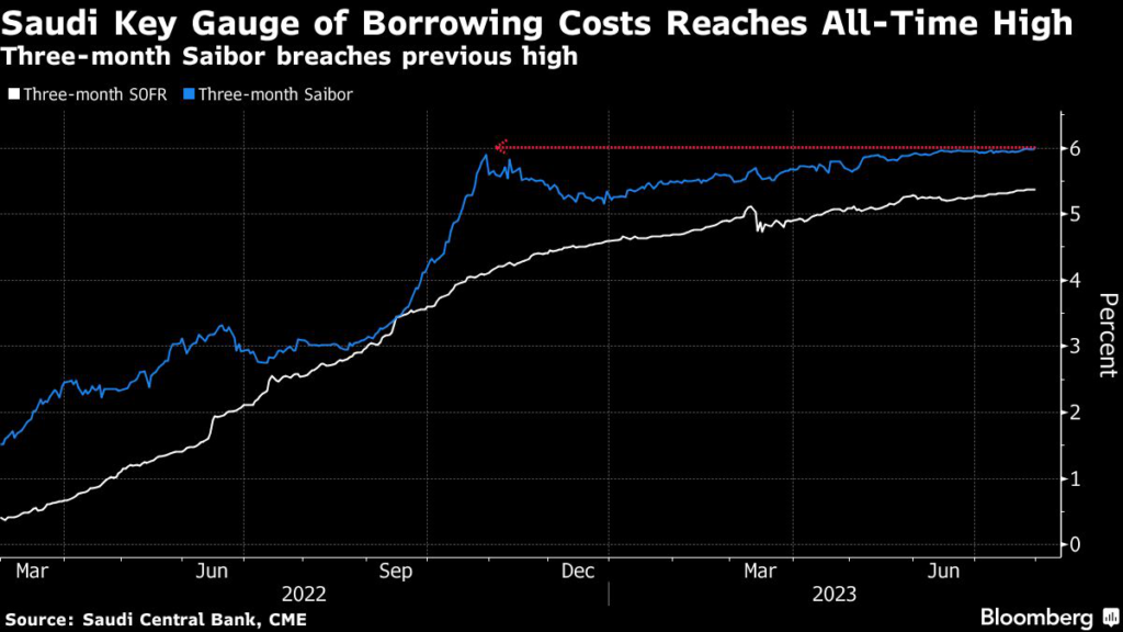 The cost of money as measured by the three-month Saudi Interbank Offered Rate, or Saibor, climbed above 6% this week, even higher than it was during the 2008 global financial crisis and after oil prices collapsed in 2020.