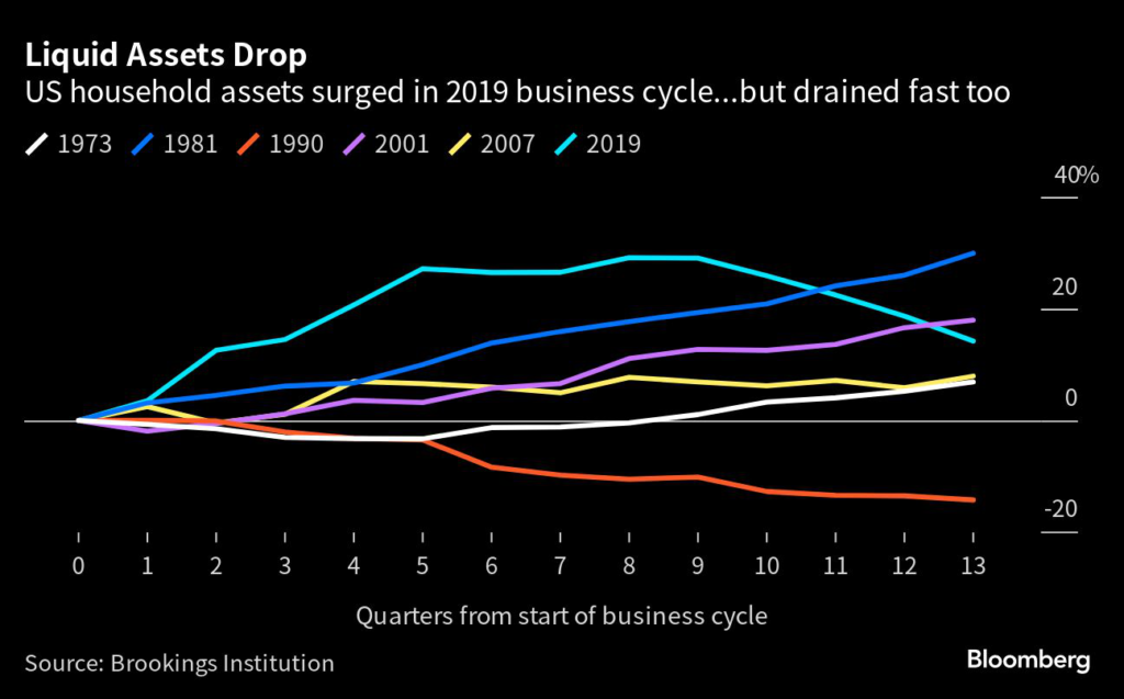 (Bloomberg) — US consumers are still spending like it’s 2021 — but that will soon change as they run out of cash, according to a report from the Brookings Institution.