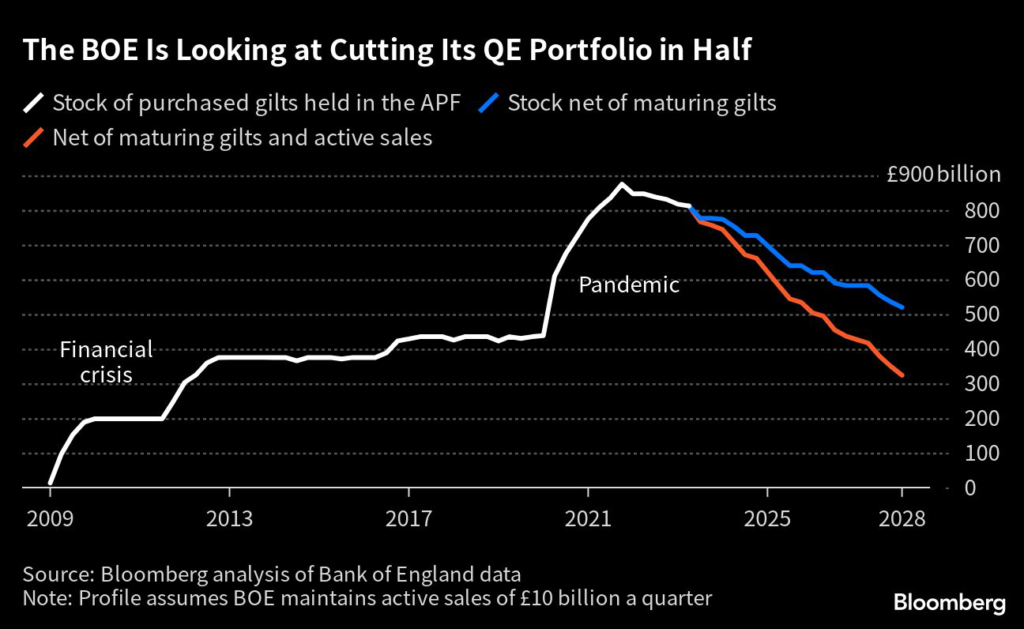 The BOE halted reinvestments of its maturing gilts and has been actively selling bonds since September, targeting a £80 billion annual portfolio reduction.