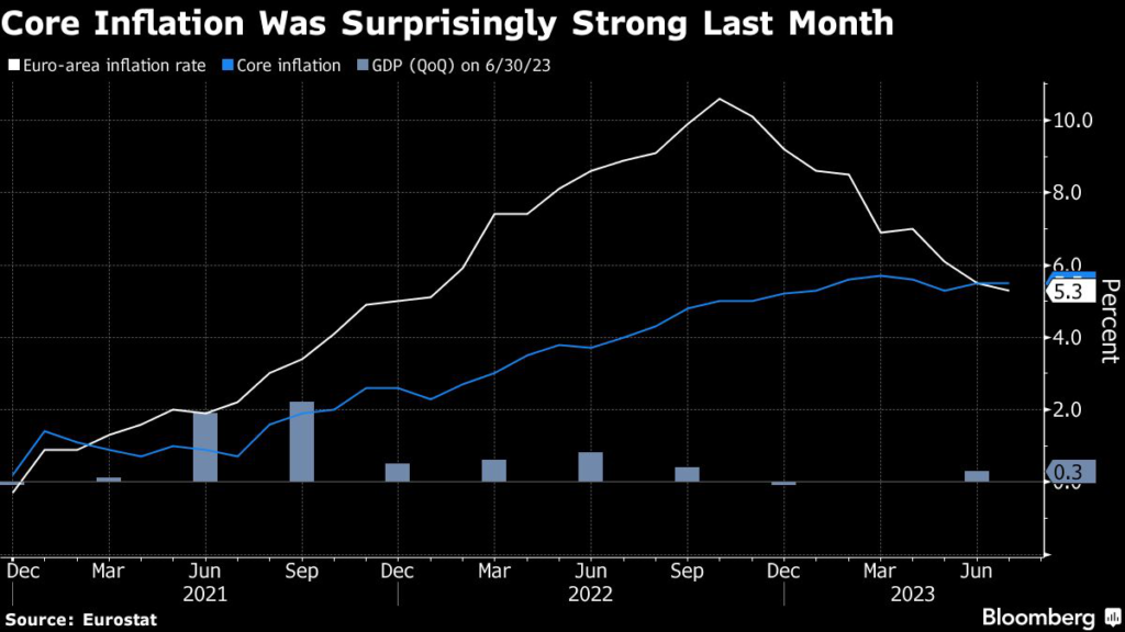 But Growth in core prices excluding food and energy costs — a gauge that’s been under particular ECB scrutiny — held steady at 5.5%.