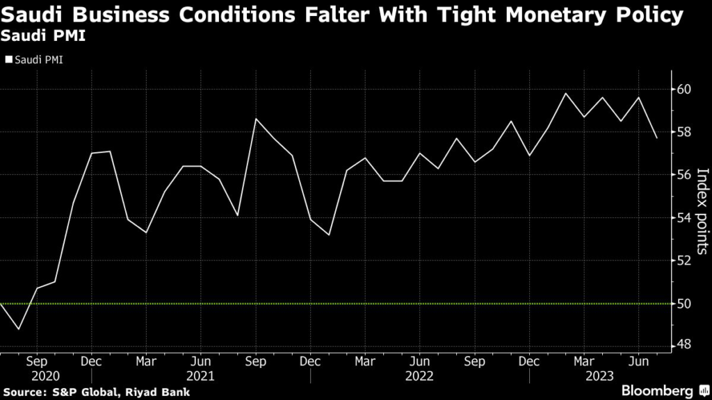 (Bloomberg) — Business growth in Saudi Arabia decelerated in July as rising interest rates started catching up with the kingdom’s non-oil industries.