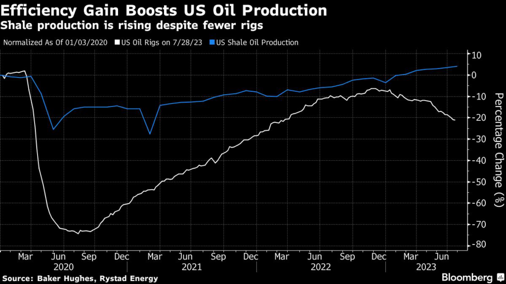 Rising efficiency has enabled shale production to accelerate even as the number of rigs drilling for oil has fallen by 15% so far this year, and oilfield contractors expect more cutbacks in the third quarter.