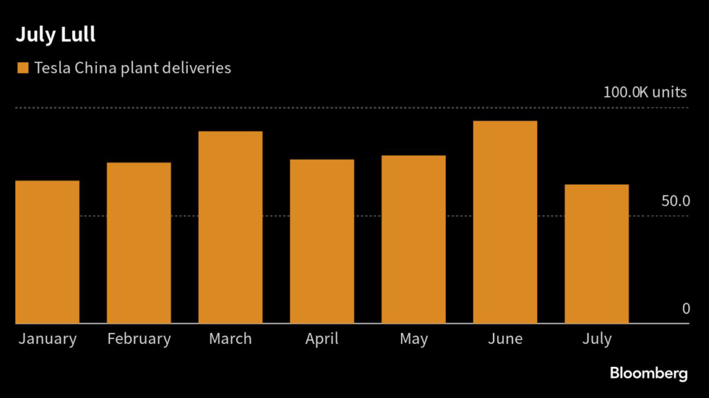 (Bloomberg) — Tesla Inc.’s China deliveries slumped in July to the lowest level this year, as the electric vehicle maker struggles to attract buyers despite price cuts and other incentives.