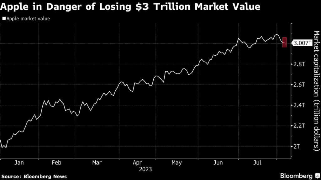 (Bloomberg) — Apple Inc.’s market value is now decisively below the historic $3 trillion level, after the iPhone maker’s outlook for the fourth quarter sparked worries over tepid demand for its handsets and other gadgets.