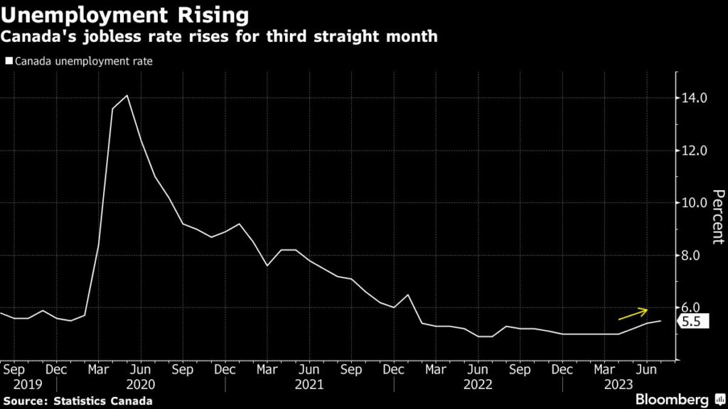 The country lost 6,400 jobs in July, while the unemployment rate rose to 5.5%, the third straight monthly increase, Statistics Canada reported Friday in Ottawa.