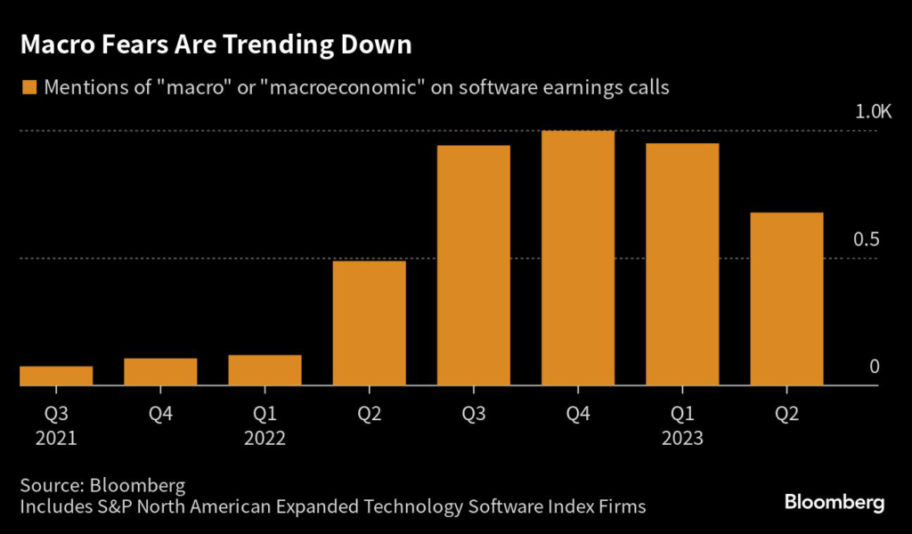 In the most recent round of earnings, they talked less about economic trends, suggesting increased optimism. References to the global economy during software company earnings calls peaked in the fourth quarter of 2022.