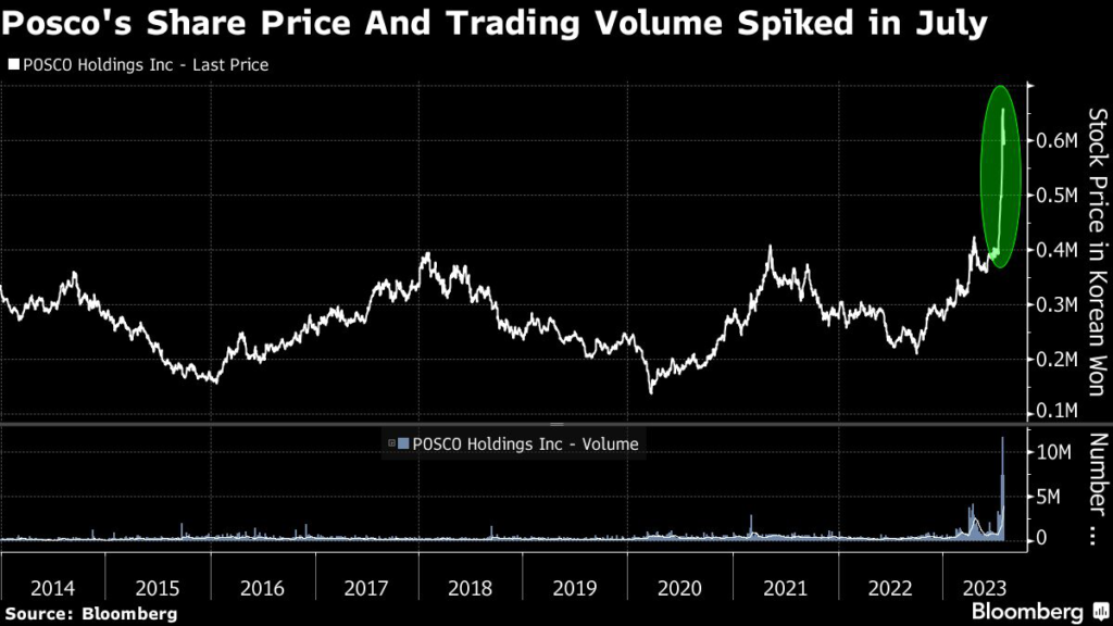 Its affiliates Posco Future M Co. and Posco International Corp. jumped 49% and 126%, respectively, last month.