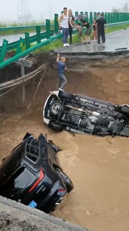 In the waterlogged provincial capital Harbin, two vehicles plunged into a sinkhole that appeared on an expressway near a swollen river, local media reported.