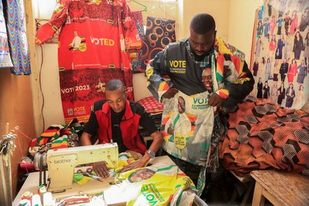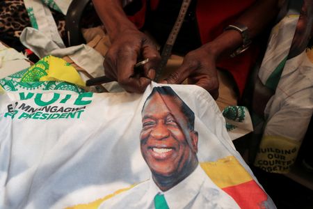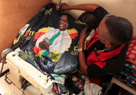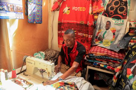HARARE (Reuters) – The whirring sound of a sewing machine can be heard a few paces from Judah Zunze’s workshop in Harare’s Warren Park township, as he stitches up political party regalia for a customer ahead of elections this month.