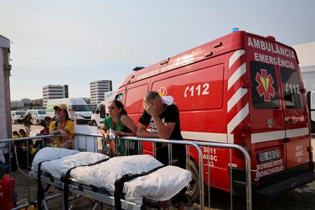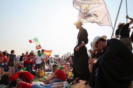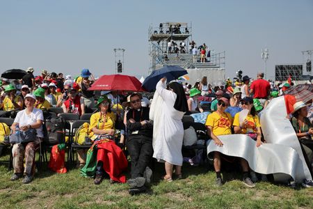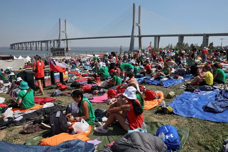 LISBON (Reuters) -Under a burning sun, hundreds of thousands of Catholics battled on Saturday to keep cool with water sprays, fans and improvised tents at a massive shadeless outdoor venue in Lisbon where Pope Francis will hold an evening vigil.